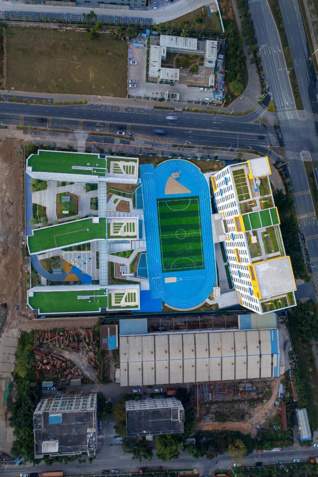 運動場跑道貫穿了整個校園,連接教學樓及宿舍,方便行人自由移動和交流。位于3層的運動場離不同樓層的教室更近,下課10分鐘,孩子們最多上下2層,便可到達運動場進行休閑活動。體育上下的空間更優化了流線,公共走廊可便捷連接教學樓和宿舍樓。