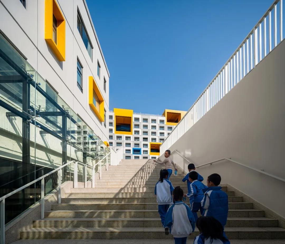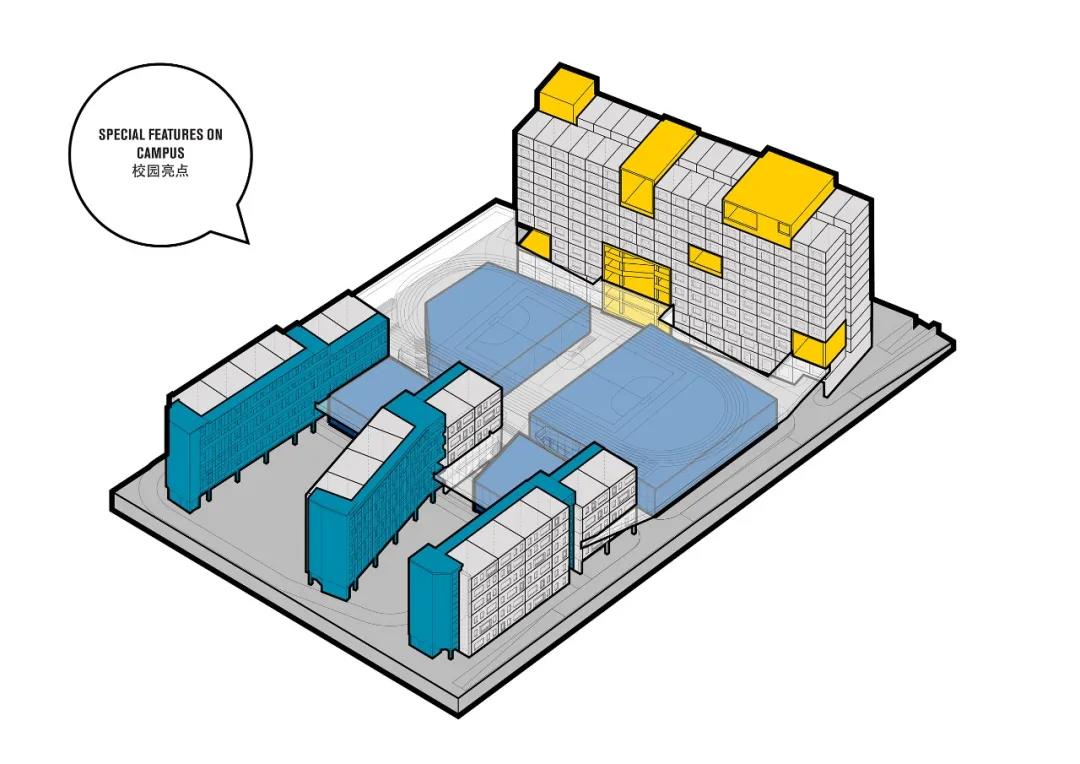 為增加學校設計的趣味性,建筑師用歡快的黃藍對比色,作為功能區域的顯著識別標志。藍色表示路徑與走廊,******表示停留與社交。