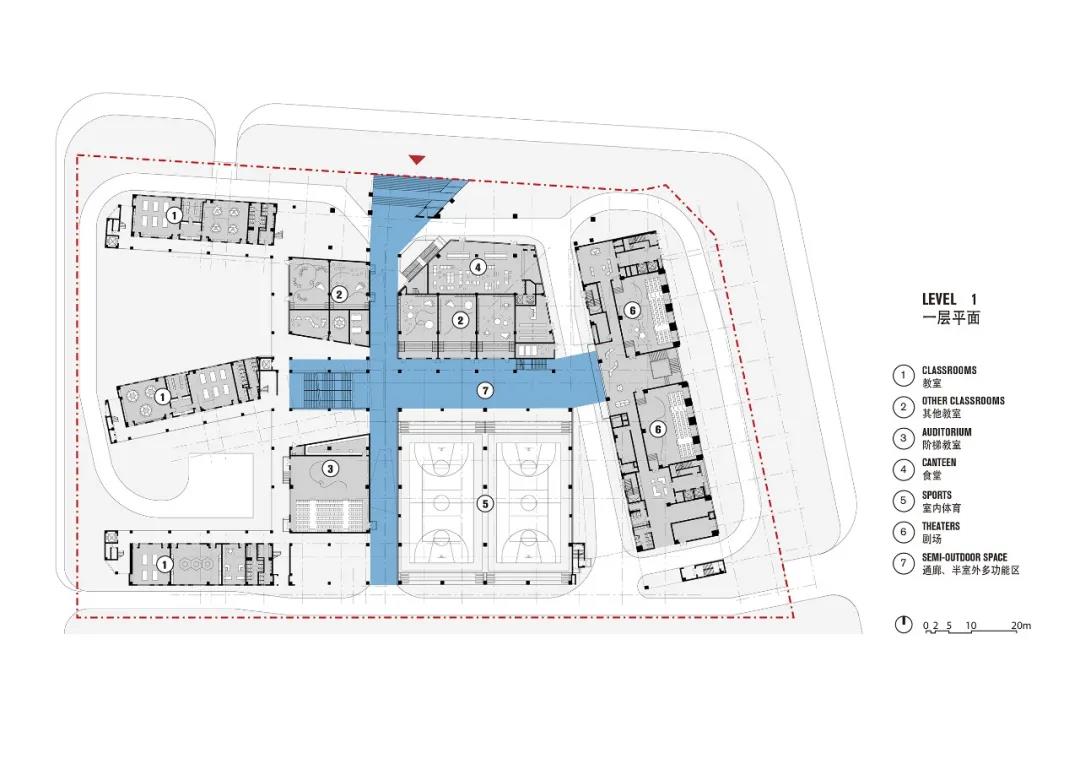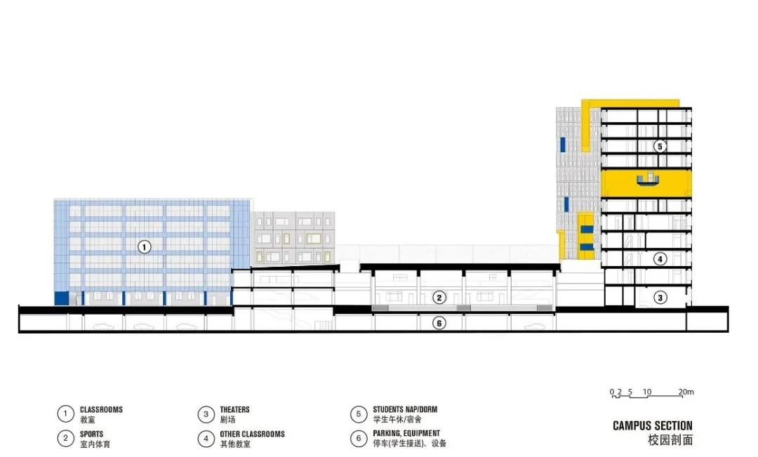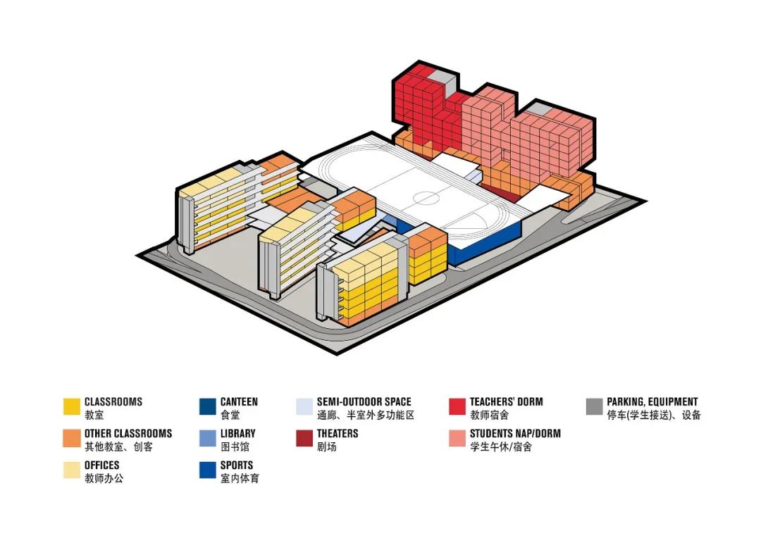 有別于傳統校園布局——通常將體育場推到外圍區域。在這里,建筑師為同學們創造了一個“高-低-高”的起伏山谷。體育場位于教學樓與宿舍樓之間,這不僅是在位置上進行功能劃分,更是在樓群中心位置形成立體連接,這里既是交通樞紐,又呈現“中心舞臺”感。