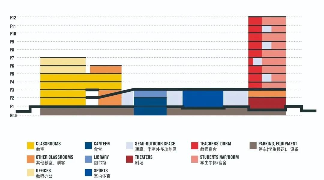 建筑師們面臨的,首先是功能多的巨大挑戰,在實際場地面積僅約1.6萬平方米的場地內,容積率接近于2.5 (一般學校建筑容積率為1左右)。校園設計必須滿足教學、宿舍、活動等各種功能;同時,又有著緊迫的時間壓力,從立項到交付學校,設計、建造周期僅僅13個月。要知道,就一般教育類建筑而言,一所高品質學校從設計到竣工,通常需要2-3年時間完成。