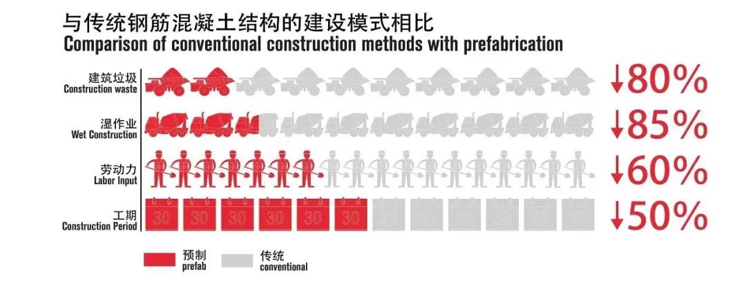 最終,在整個學校項目里,約75%的建筑面積是以裝配式建設的,這極大地減少了現場建筑垃圾、勞動力投入,且所用工期僅為常規施工的1/2,節省了預算和時間。在采用裝配式結構的同時,Crossboundaries的建筑師們強調了最大的靈活性和美學性,同時又為高密度項目提供了巧妙的解決方案。這一大膽的設計,不僅是試圖最大程度地發揮裝配式建筑的潛力,并且為實現具有重大社會影響力的項目做出貢獻的機會。