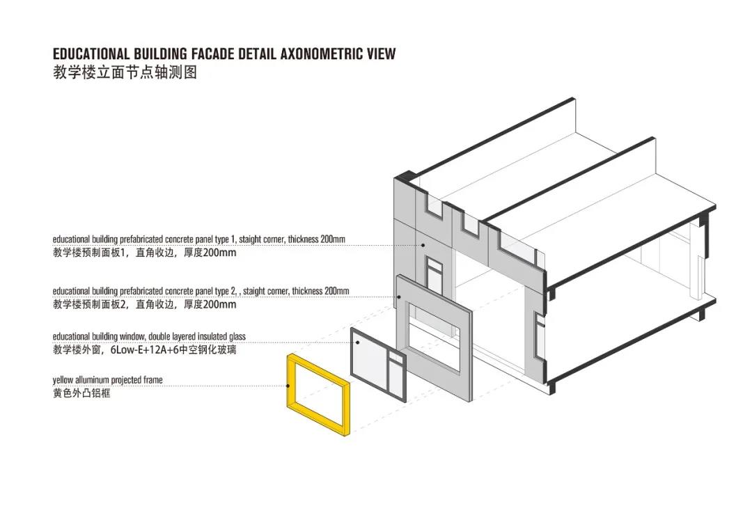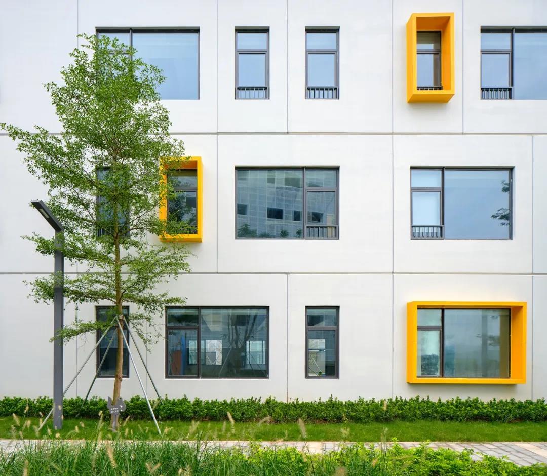 教學樓的窗洞,構成了節奏變化的立面。身處工業區,廠房與大片集裝箱單調冰冷,在靈動開窗映襯下,學校凸顯特別又毫無違和感。在三棟教學樓中,建筑師共采用了六種不同寬度的預制板,通過預制板錯位排布,窗戶大小尺寸交替變化,使教學樓立面產生了變化, 一些選定的窗戶開口周圍還設置了帶有******突出金屬框作為裝飾,凸顯視覺上的趣味性。