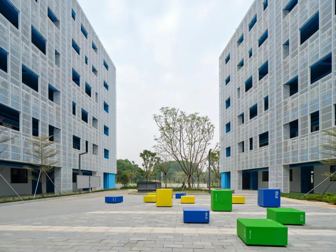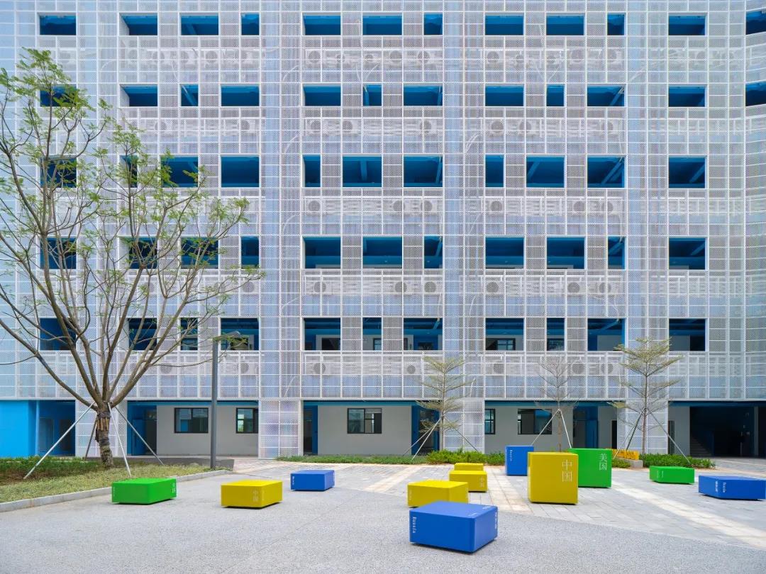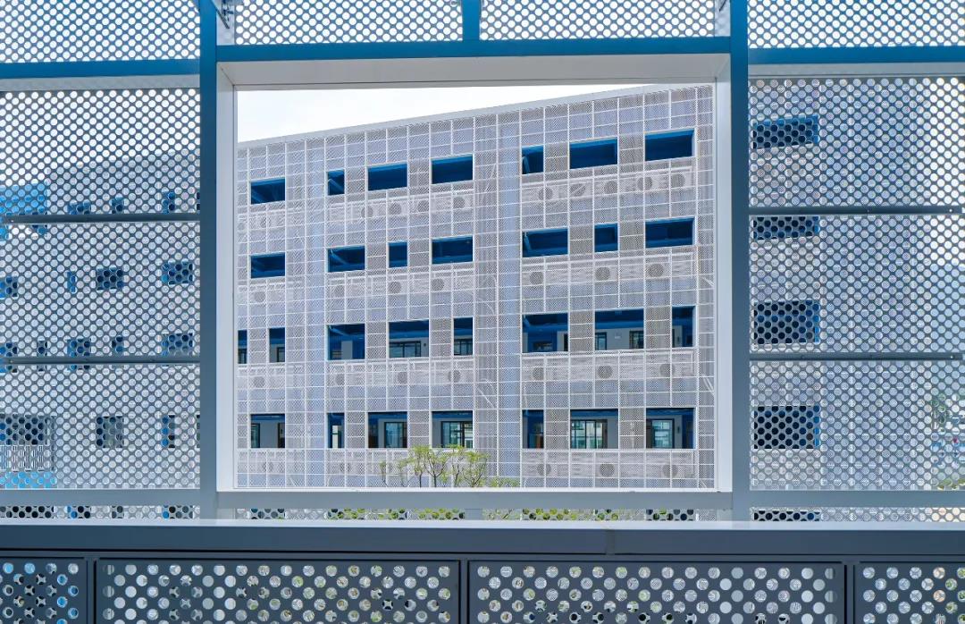 朝向走廊一側,設計考慮到了深圳當地的亞熱帶氣候。許多學校大樓的公共區域保持開放狀態,為了實現最佳的外觀效果及空氣流通,將由穿孔金屬板構成的輕質外墻應用于教學建筑,這除了具有功能優勢外,還賦予了其更多的視覺效果,并揭示了背后的色彩和師生的活動,也對空調室外機起到了隱藏作用。