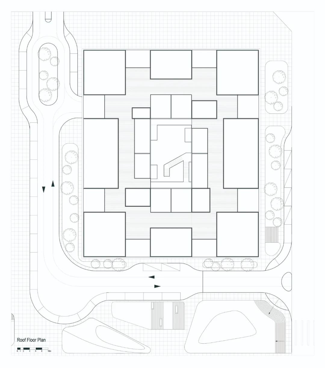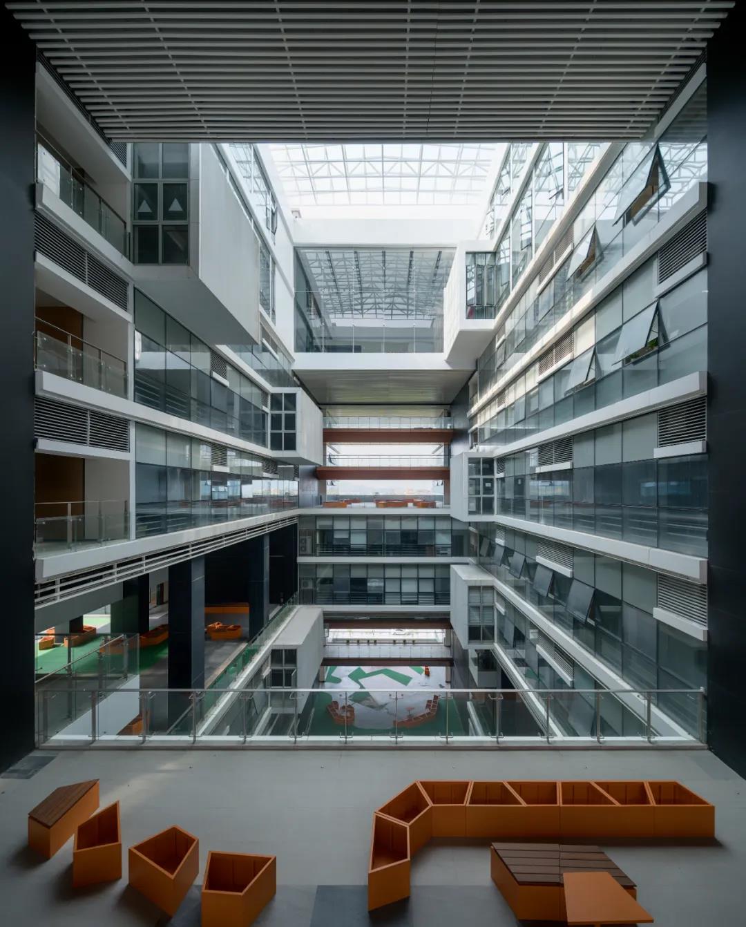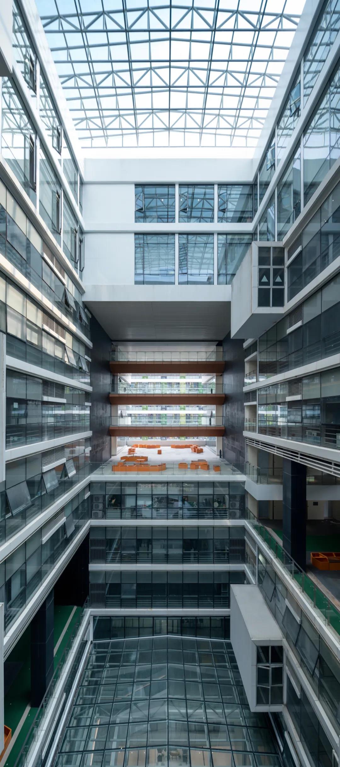 為了在高層建筑中實(shí)現(xiàn)類似低層廠房建筑的街道公共空間,我們打開建筑的“核心”,把一個(gè)“大核”拆解成幾個(gè)“小核”,讓建筑原本的“實(shí)心”變成“空心”,有更大的空間撐滿可建設(shè)用地,樓板圍繞四個(gè)核心筒像搭積木一樣展開,并在頂層預(yù)留了未來企業(yè)擴(kuò)展的空間(后續(xù)也確實(shí)被入駐企業(yè)改造擴(kuò)建了)。
