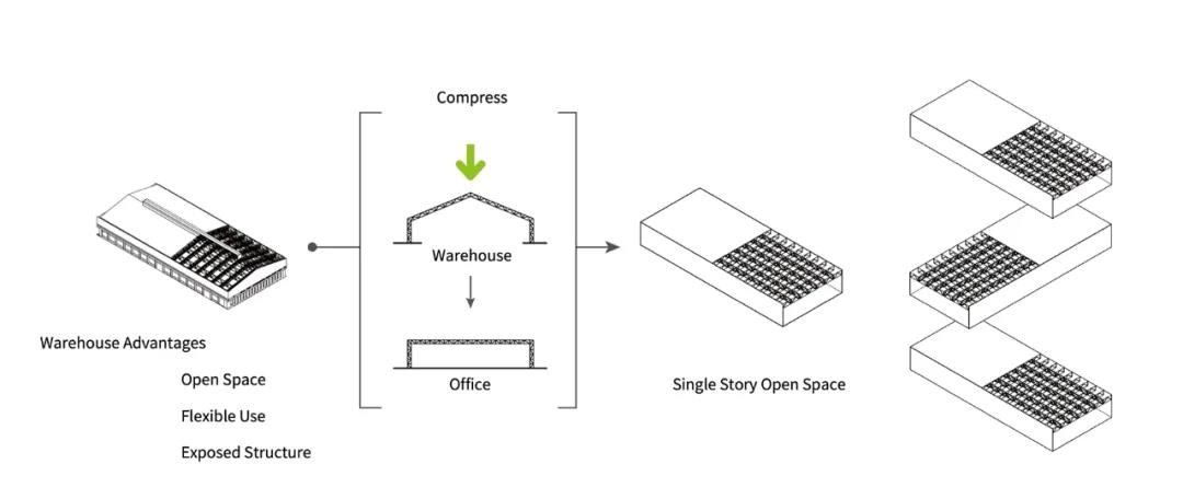 基于大量的設(shè)計(jì)研究我們得出,創(chuàng)意產(chǎn)業(yè)類項(xiàng)目很多都是廠房改造的,創(chuàng)意產(chǎn)業(yè)人員對于Warehouse空間類型情有獨(dú)鐘,究其原因應(yīng)該是其開敞的平面、靈活的空間和外露的結(jié)構(gòu)。為此,我們首先確定了開闊大平層的空間類型。