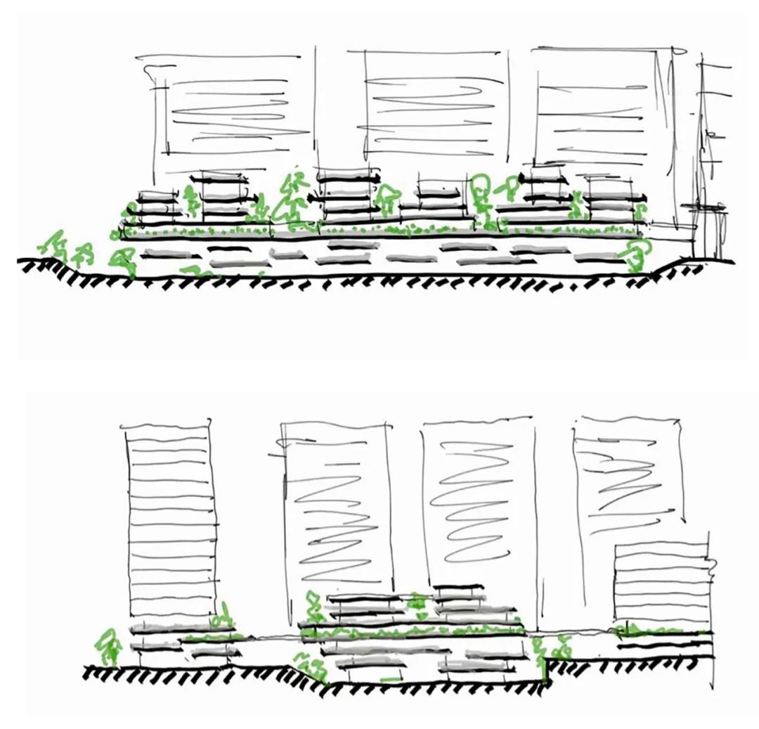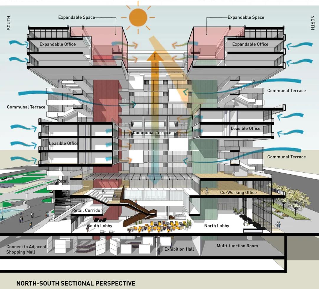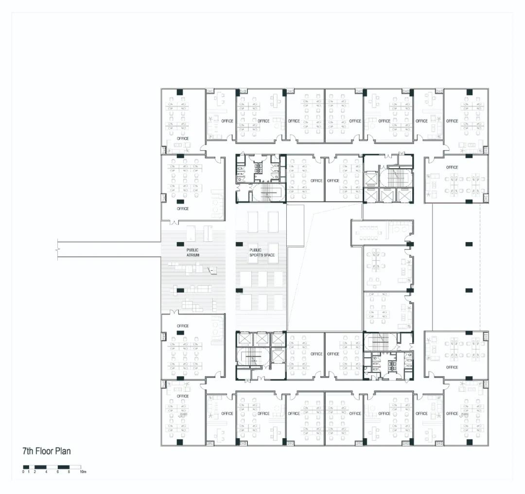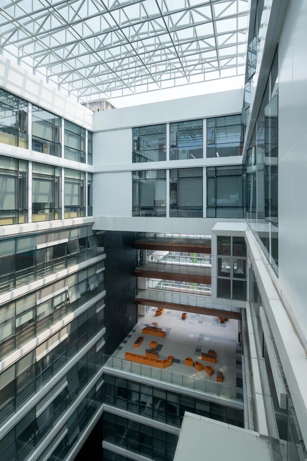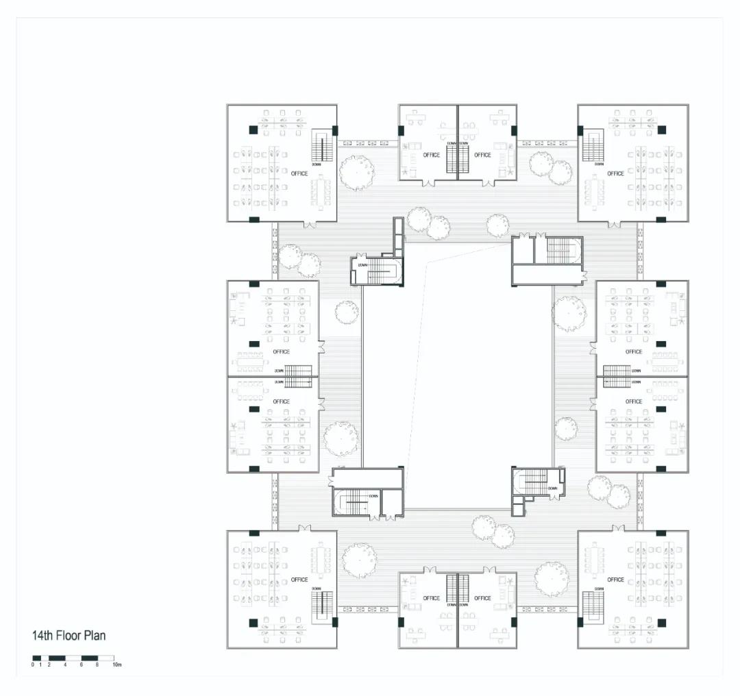 原本單調(diào)孤立的樓板產(chǎn)生了空間關(guān)系,低層建筑的街道公共空間出現(xiàn)在高層的結(jié)構(gòu)中,同時(shí),內(nèi)側(cè)的辦公空間也有自然采光和通風(fēng),各層大平層均可雙側(cè)采光,這里辦公的人,也有機(jī)會看到彼此,提升了場所認(rèn)同感。