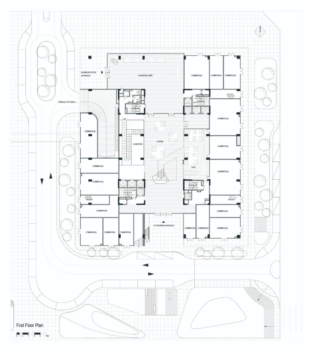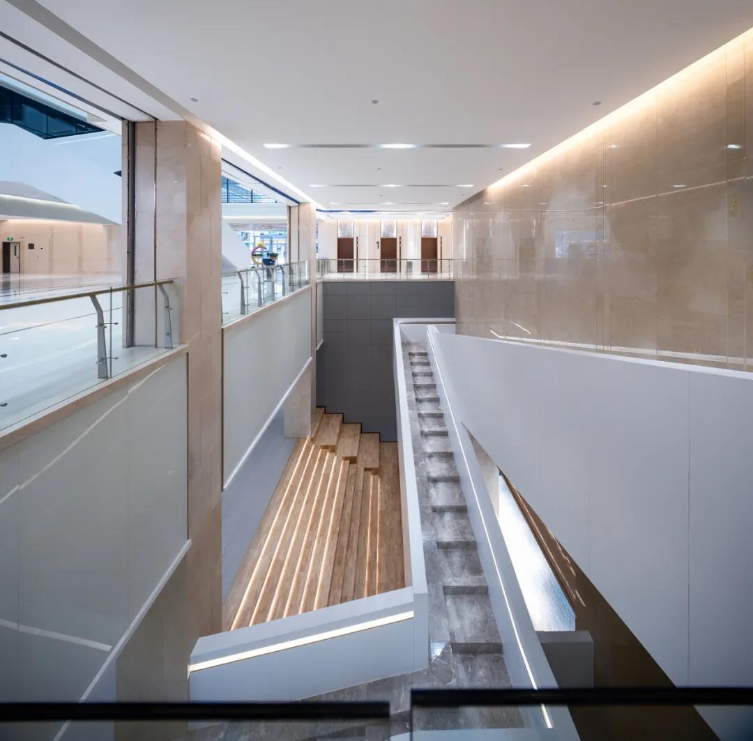 建筑的入口設(shè)計(jì),前期要提供銷售展廳空間,后期既要增加人氣,保持首層的公共性,又要確保辦公場所進(jìn)出的安全,為此,我們將大廳的南北打通,形成穿堂的人流,增加內(nèi)部商業(yè)的可達(dá)性;同時(shí)北部大廳的入口設(shè)置在西側(cè),提供一個(gè)可以完整獨(dú)立使用的臨時(shí)銷售大廳。