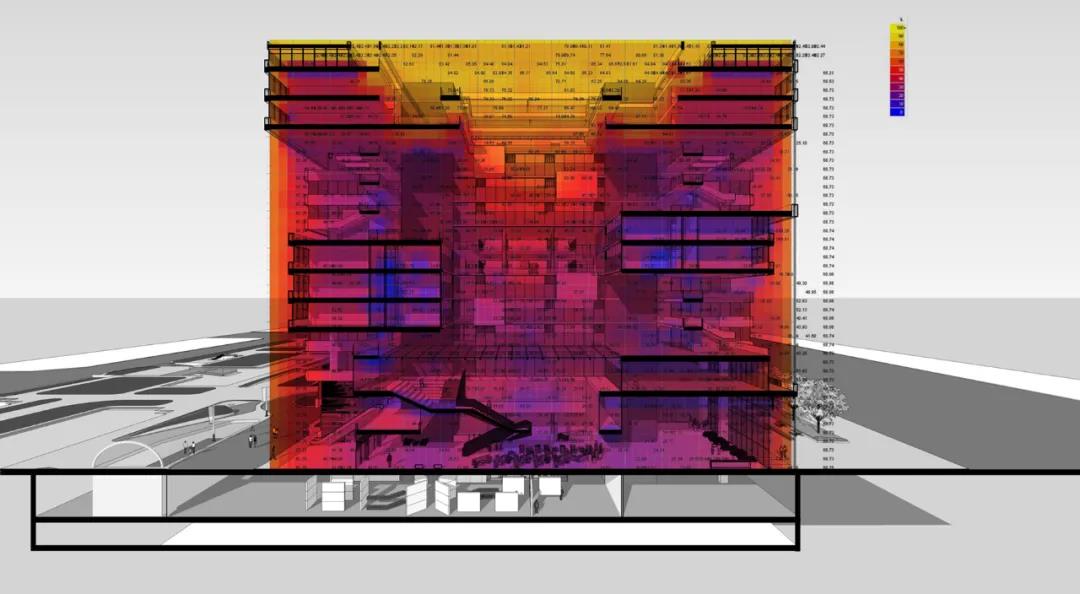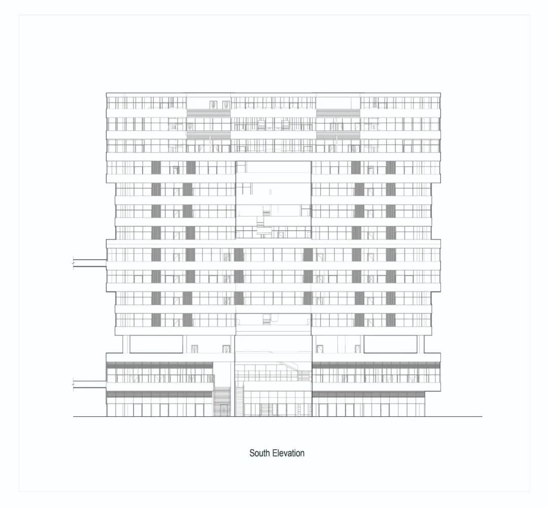 設(shè)計(jì)按照每三層共享一個(gè)大平臺的空間邏輯,隨著樓層的變化,依次在四個(gè)面的不通高度位置出現(xiàn)。我們在方案擴(kuò)初階段采用ArchiCAD的BIM建模型方式,全部外墻圖紙由三維模型直接導(dǎo)出成圖,所有空調(diào)室外機(jī)以及頂板等二次結(jié)構(gòu)一體澆筑成形。